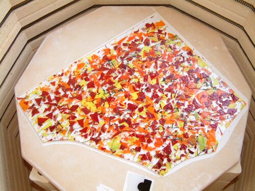 こんにちは。 2回目の投稿です。 一晩かかってゆっくりさました紅葉のガラスとごたいめ~ん! い~じゃ~ん! 覗き窓から見た焼き具合が硬そうだったので途中で焼成温度を上げようかと迷ったんだけど、上げなくて良かった~。 釜から出してみよう。上の段は…