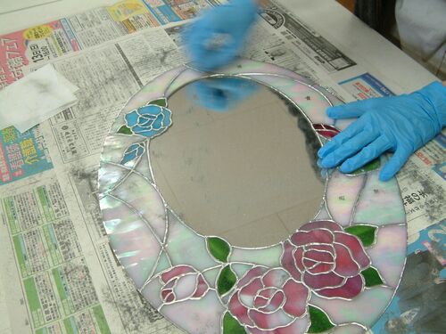 こんにちは。 娘の結婚式まであと10日ほど。ウェルカムボードのステンドグラスが完成した。 ここまでほとんど娘自身が作ってきた。鏡だけはカットが複雑で難しいため僕が切ってやったけど。 ハンダ付けが完了したパネルをスチールウールで磨く。パティーナ…