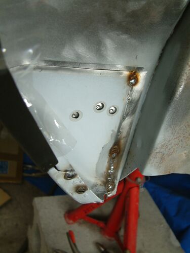 こんにちは。 ホイールハウス溶接の続きだ。これはタイヤハウスの内側から前方を見たところ。 オリジナルとレプロの合わせ目、およびロッカーパネルとの接合部(丸穴)を溶接していく。 ロッカーパネルとのプラグ溶接穴。鉄板の板厚に対する標準電流よりも強い…