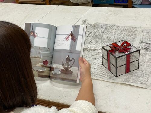 こんにちは。 土曜夜のSUさん、先週完成させた箱型ランプにワックスをかけた。 ステンドグラスはガラスにコパーテープを巻き、そのテープをはんだ付けすることで形を作っていく。 はんだはそのままでは腐食したり銀色が濁ってしまうのでパティーナ仕上げと…