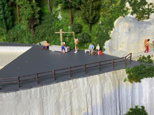 こんにちは。 右岸の仕上げを毎日しています。 山の中腹にある高原レストラン周りの人物を配置します。 ジオラマが完成すれば奥の方になるので手が届きにくくなります。 人物模型の配置は大変繊細な作業になりますので右岸を接続、完成してからでは困難です…