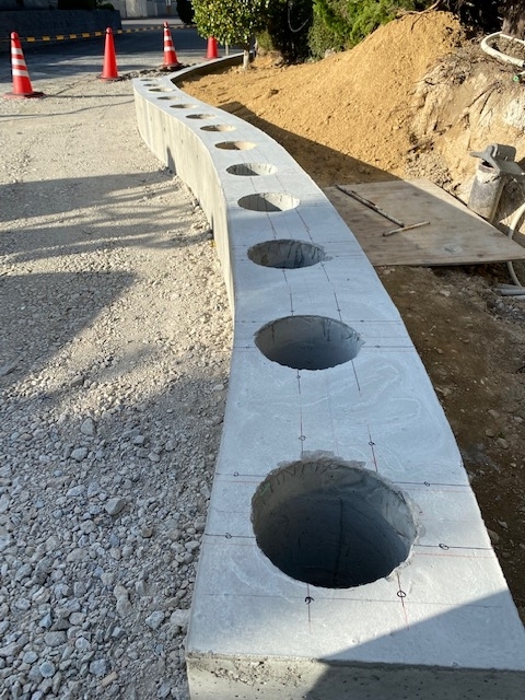 2023-04-10 美術館入り口 路盤工事 ミュージアム 日常 こんにちは。 美術館外構工事が一段落だ。 入り口通路の路盤工事が終わり、明日からアスファルト舗装工事に入る。 小型のロードローラーだ。 入り口から構内を望むと美しいカーブのアプローチが見える。 S字カーブの擁壁。 丸い穴には四角いコンクリートの柱が立つ。エクステリアのデザインだ。 仕上がりが楽しみだ。