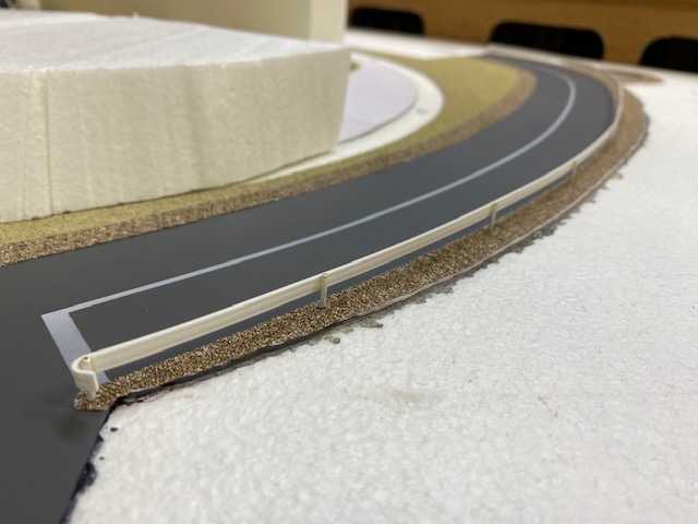 2023-04-22 ガードレールの製作 ジオラマ 日常 こんにちは。 入り口看板の2回目の塗装も終え、ちょっとキリが付いたので久々にジオラマ製作を再開する。 きょうは足りないガードレールの製作だ。 右岸のトンネルにつながるカーブの道。ここにガードレールを設置しよう。 丘に通じる坂道を接着した後だと取り付けにくくなるから今のうちなのだ。 ガードレール支柱も40~50本は追加で作らないといけないだろうな。 レールは1ミリ厚の発泡塩ビシートをローラーガラスカッターでへこませて作る。 こちらも10本ぐらいは要るだろうか? 頑張りますっ!!