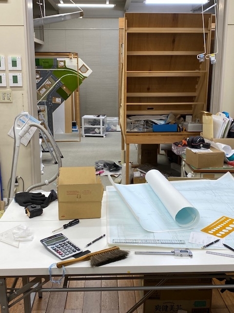 製図機が母屋の二階のデザインルームにあったのだが、ジオラマの近くに持ってきた方が、なにかと設計がはかどる。